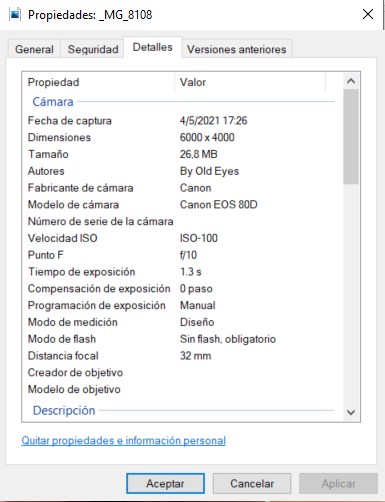 El tiempo de obturación es largo de 1,3 lo cual utilice trípode para ello, este tiempo fue para compensar el diafragma cerrado y el iso en 100.